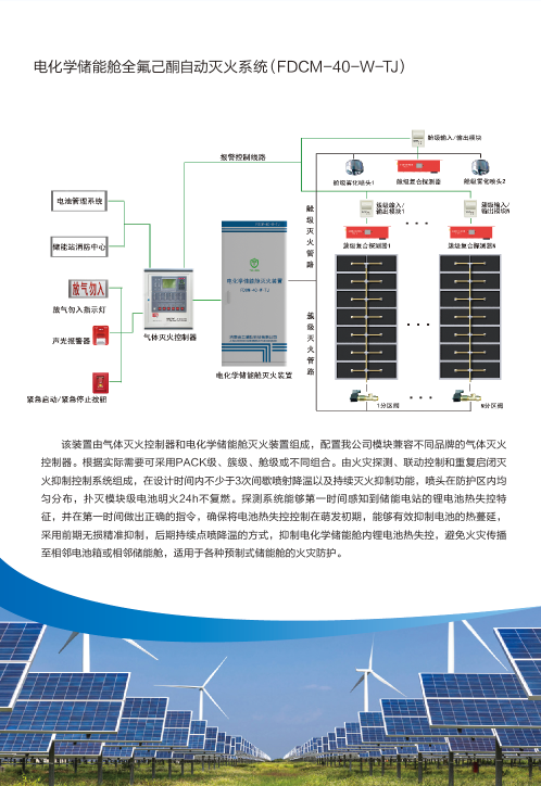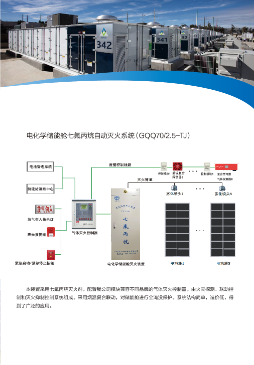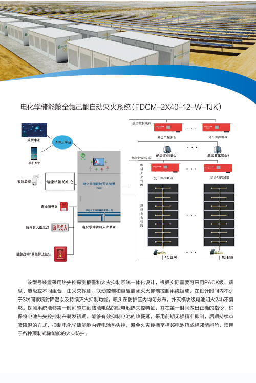 金工消防依据国家、地方(山东省)有关电化学储能站(舱)的法律、法规、技术标准(规程、规范),立足于我国电化学储能站(舱)的消防安全实际需求,采用先进的消防安全技术、材料,开发了具有一定先进性、针对性(复燃)、可靠性、高性价比、贴近实际应用的电化学储能站(舱)消防安全系统技术方案。